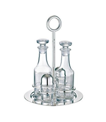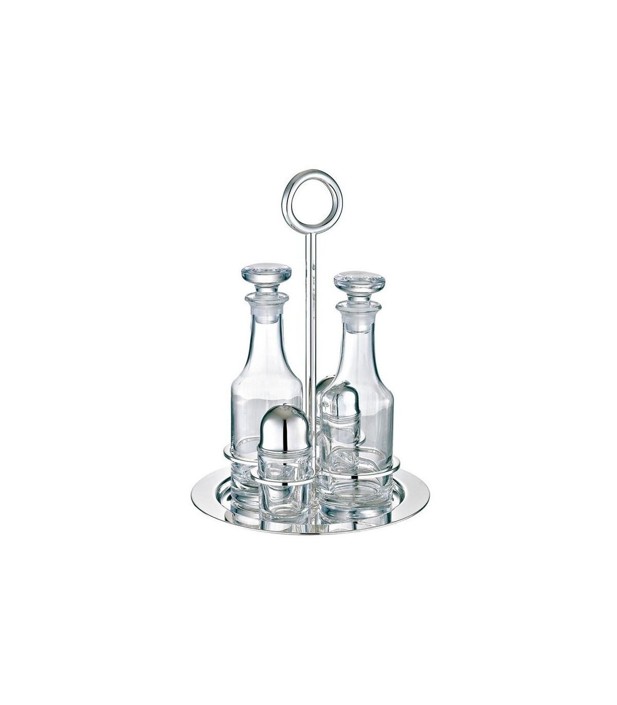The set consists of one vinegar and one oil carafe as well as a salt and a pepper shaker housed comfortably on a silverplated stand. All four seasoning items are held in position by a ring-shaped mounting. The typical "Vertigo" ring motif appears here as a decorative element and serves as a very practical handle at the top of the silverplated cruet.