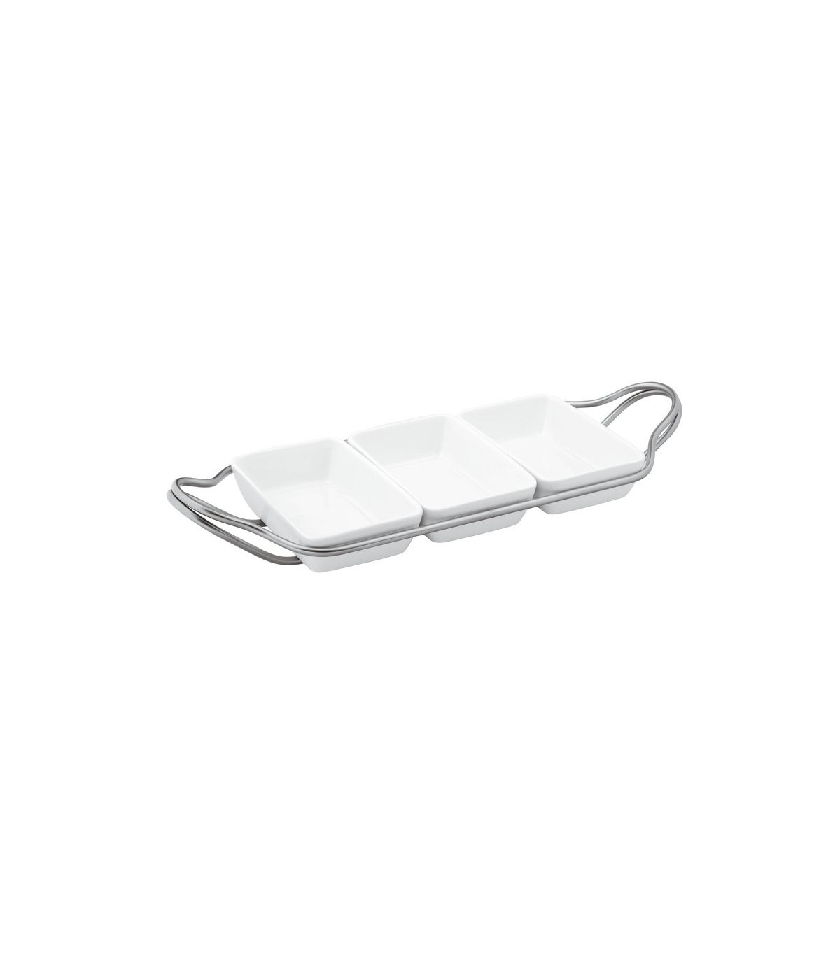 An elegant line of stainless steel holders to accompany porcelain casserole dishes