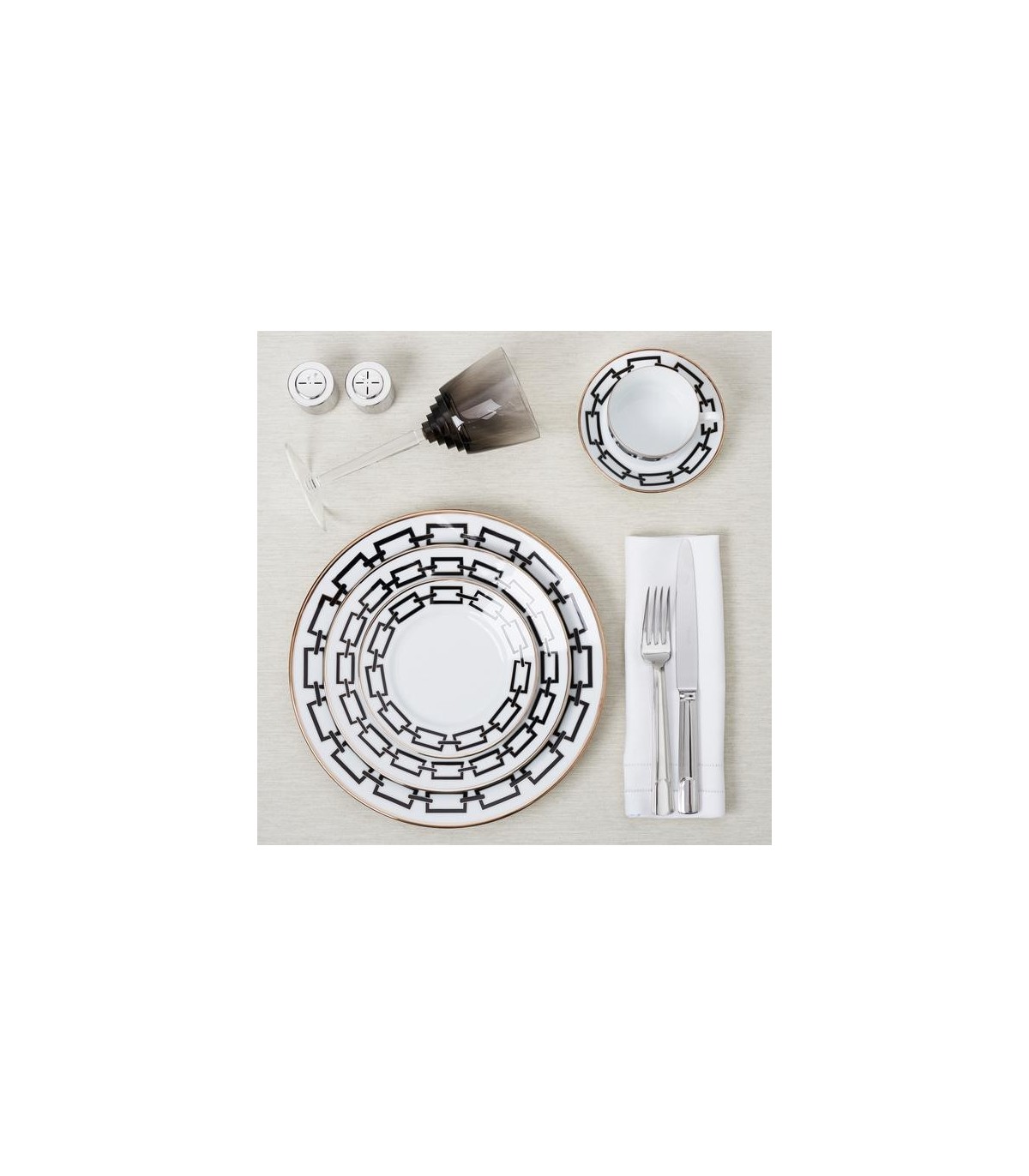 The black links of the chain are in exciting contrast to the pure white of the porcelain. The platinum refinement of the design lends the "Catene Nero" dinnerware an opulent character.