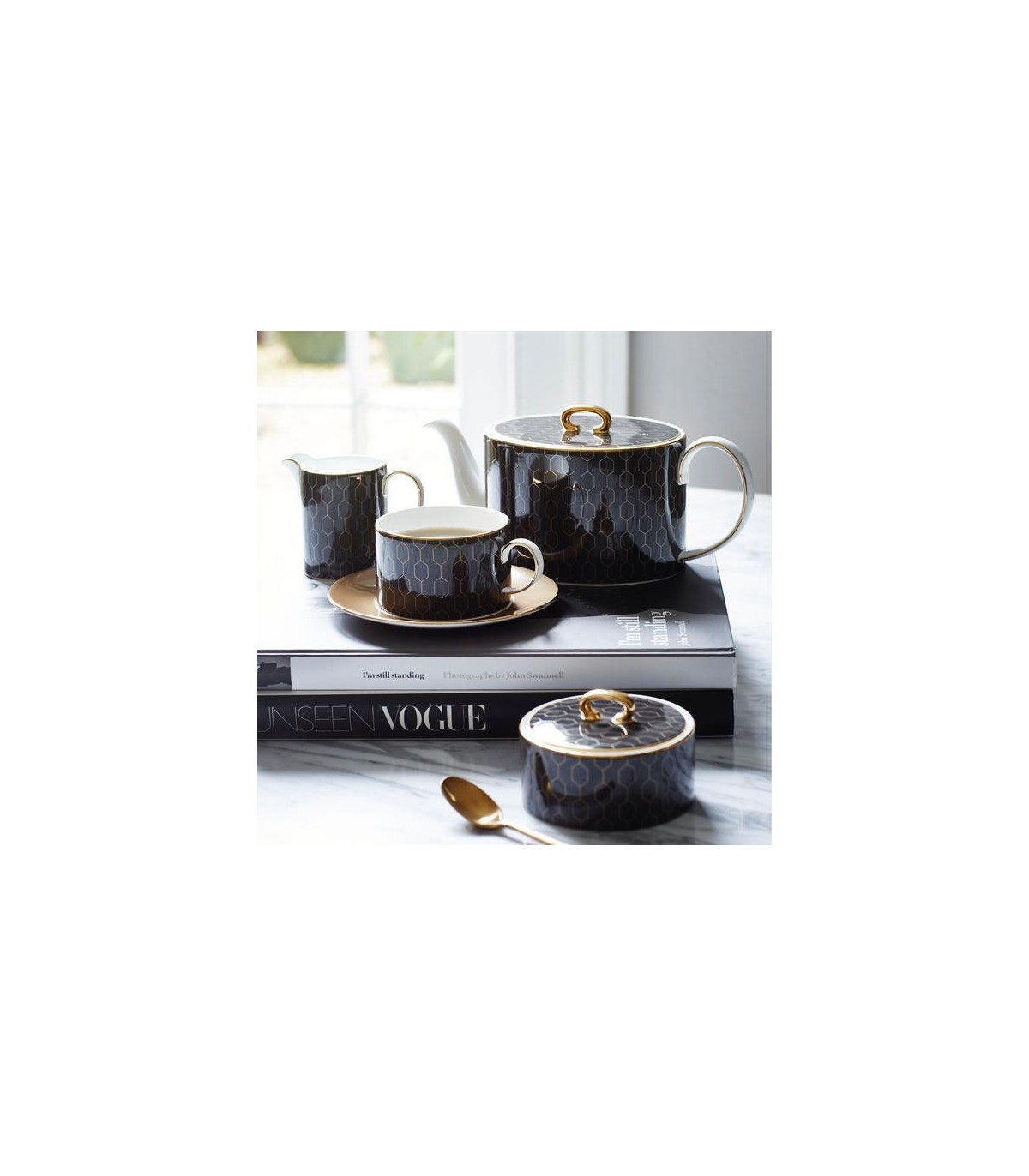 Black, white and gold are the dominant colours of this fine bone china dinner service from Wedgwood.