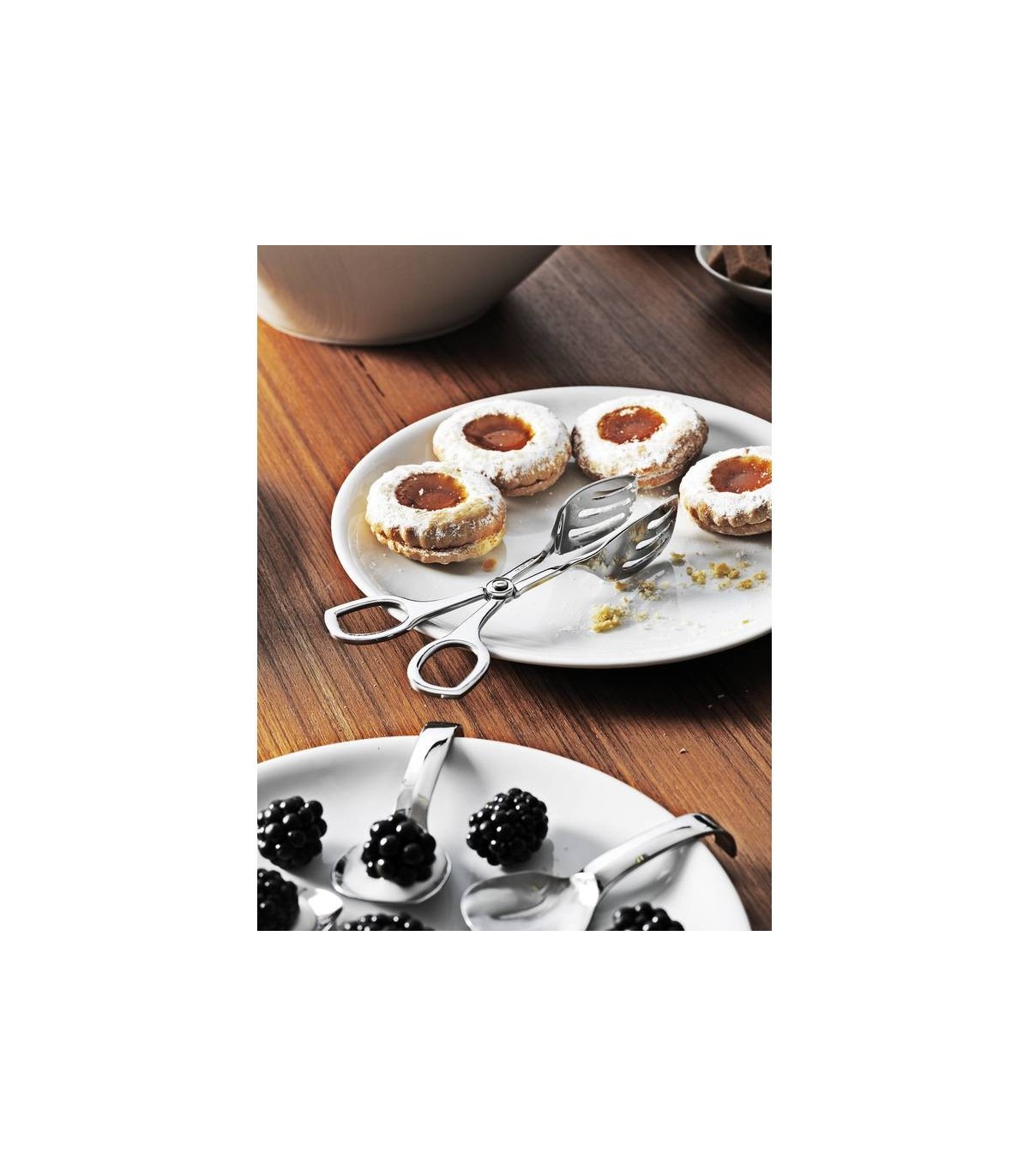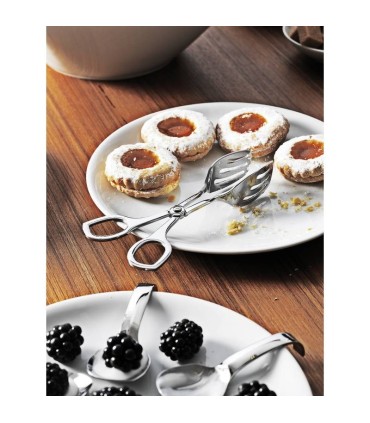 The tongs can pick up portions of vegetables, bread and pastry by a simple pressure of the hand, while the scissors are for precise serving.