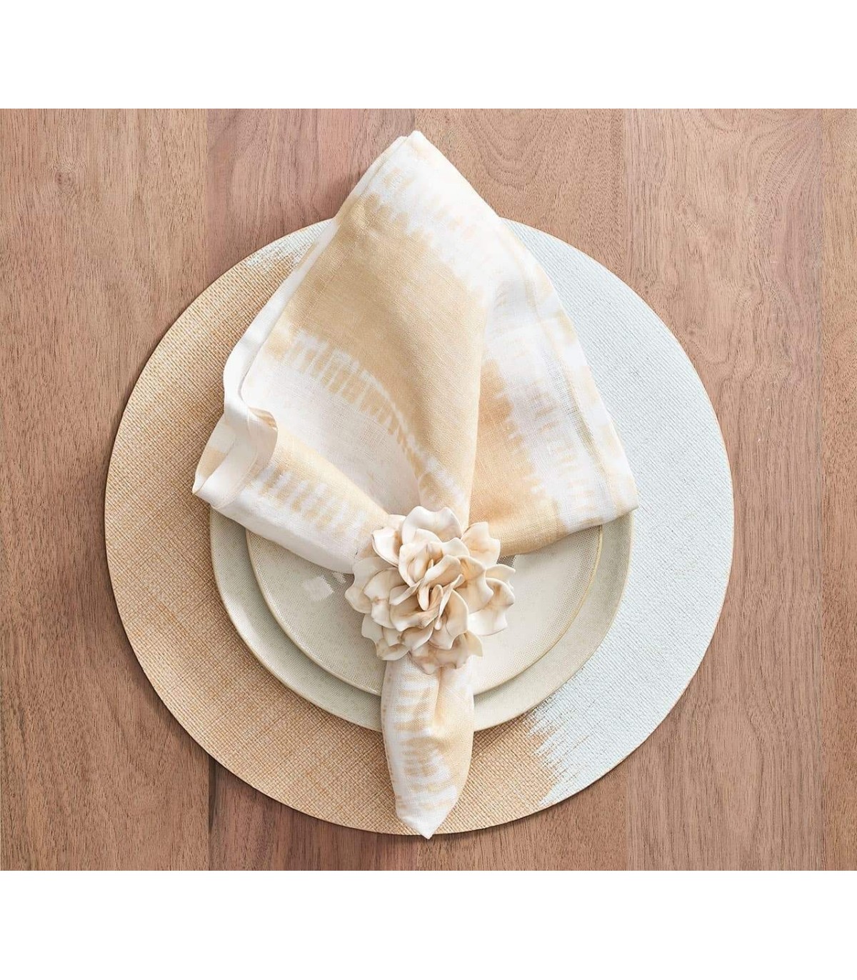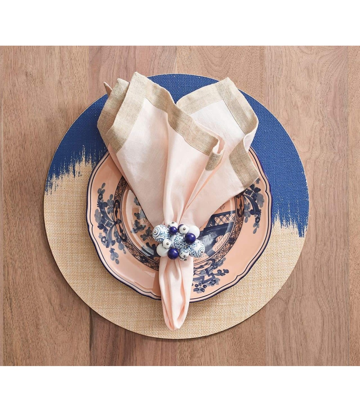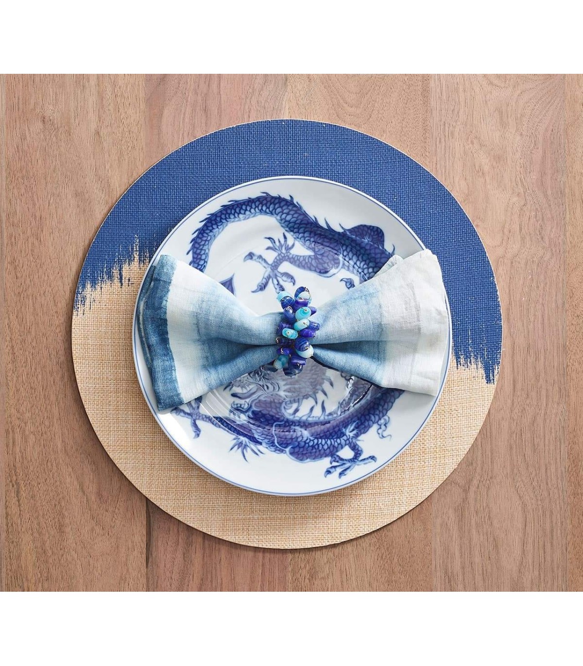 The natural color, round Brushstroke Placemat features a rich green accent reminiscent of a thick brushstroke. Variegated vinyl threads are woven together to replicate a round, raffia placemat. This round placemat has the look of natural fibers yet is easily cleaned. A silkscreening process is employed to print the vibrant green color on the round placemat.